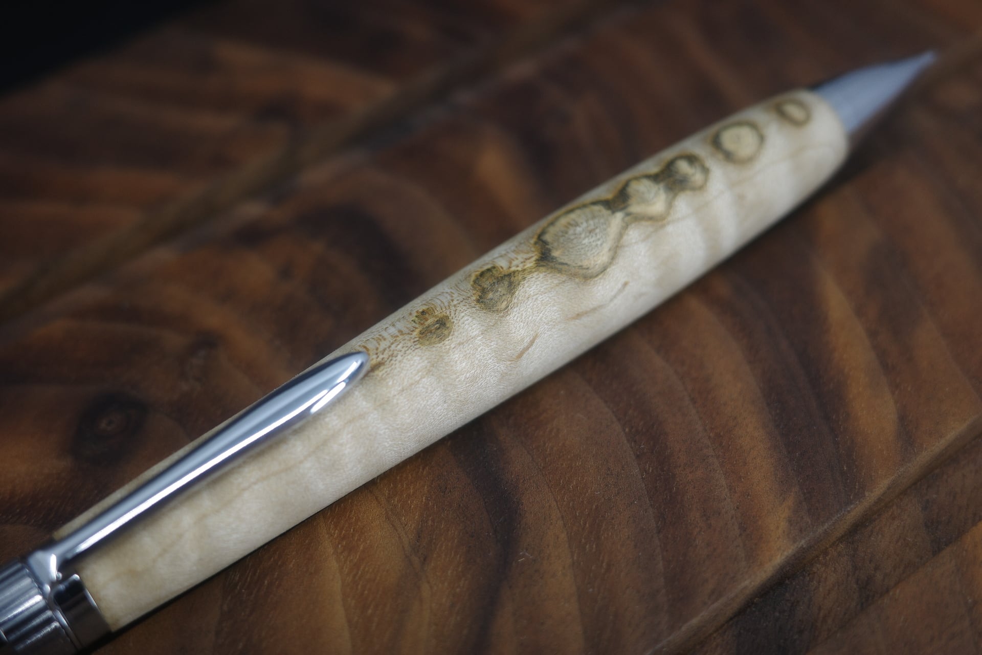 ムクロジ科の広葉樹。 虫食い跡が模様のように残ったメイプル材。アンティークな質感とデザイン性の高さが魅力的な個体。